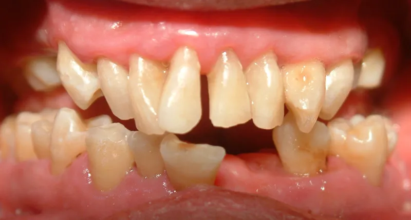 歯周病が進行すると、歯を支える顎の骨が徐々に溶かされ、歯がグラグラし始めます。また、次の画像のように歯が長く見えてしまい、口元の審美性も損なわれます。