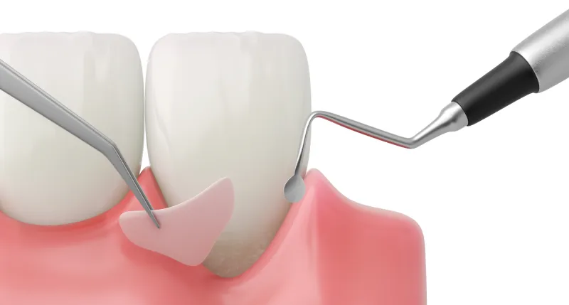 歯周病が進行すると、この画像のように「歯が長く」見えてしまいます。 この状態を改善するには「歯肉移植術」を行います。上顎からご自身の歯肉を切り取り、患部に移植することで、自然な見た目にする治療法です。